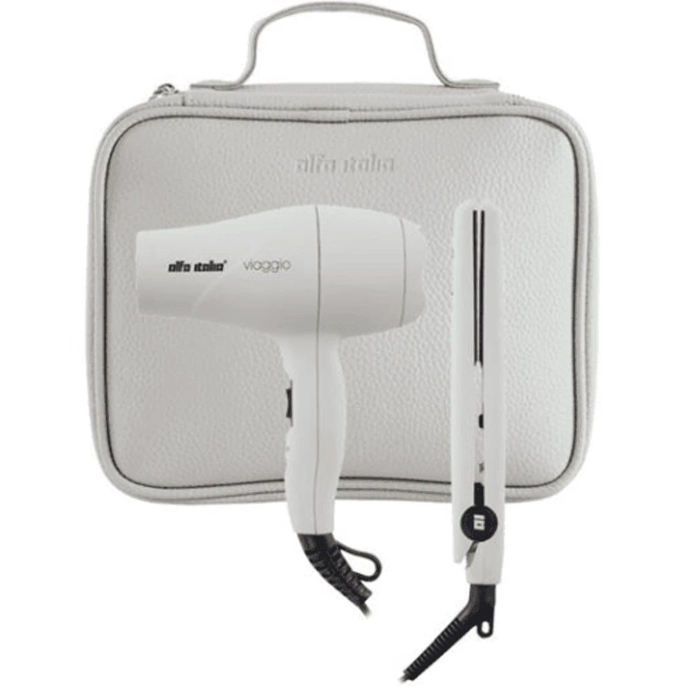 This travel styling kit is everything the style conscious woman needs to keep her hair on point when travelling… An ultra compact hair dryer and hair irons with near salon performance in a beautiful compact black faux leather carry case.