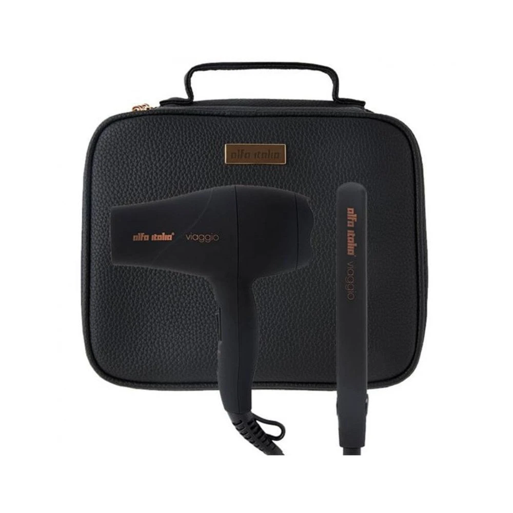 This travel styling kit is everything the style conscious woman needs to keep her hair on point when travelling… An ultra compact hair dryer and hair irons with near salon performance in a beautiful compact black faux leather carry case.