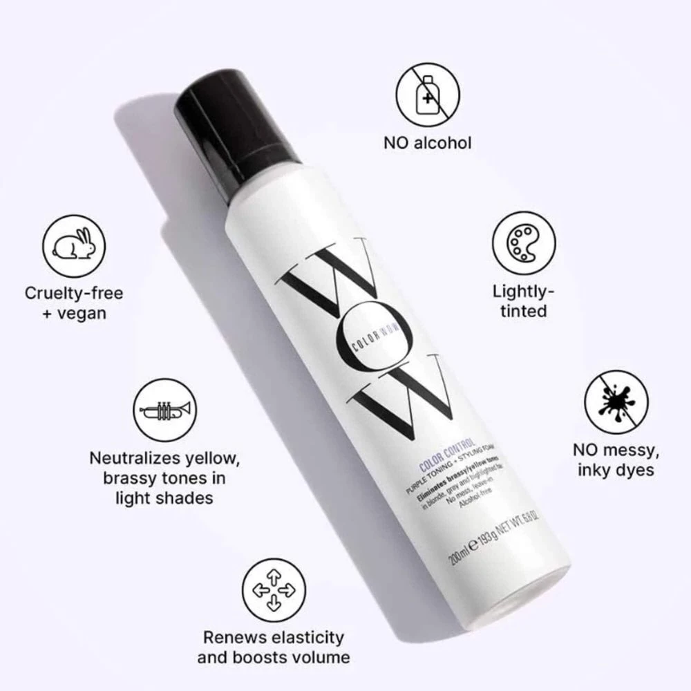 Catering specifically for blonde hair, the Brass Banned Correct and Perfect Mousse from Color wow works to banish unwanted yellow and brassy tones