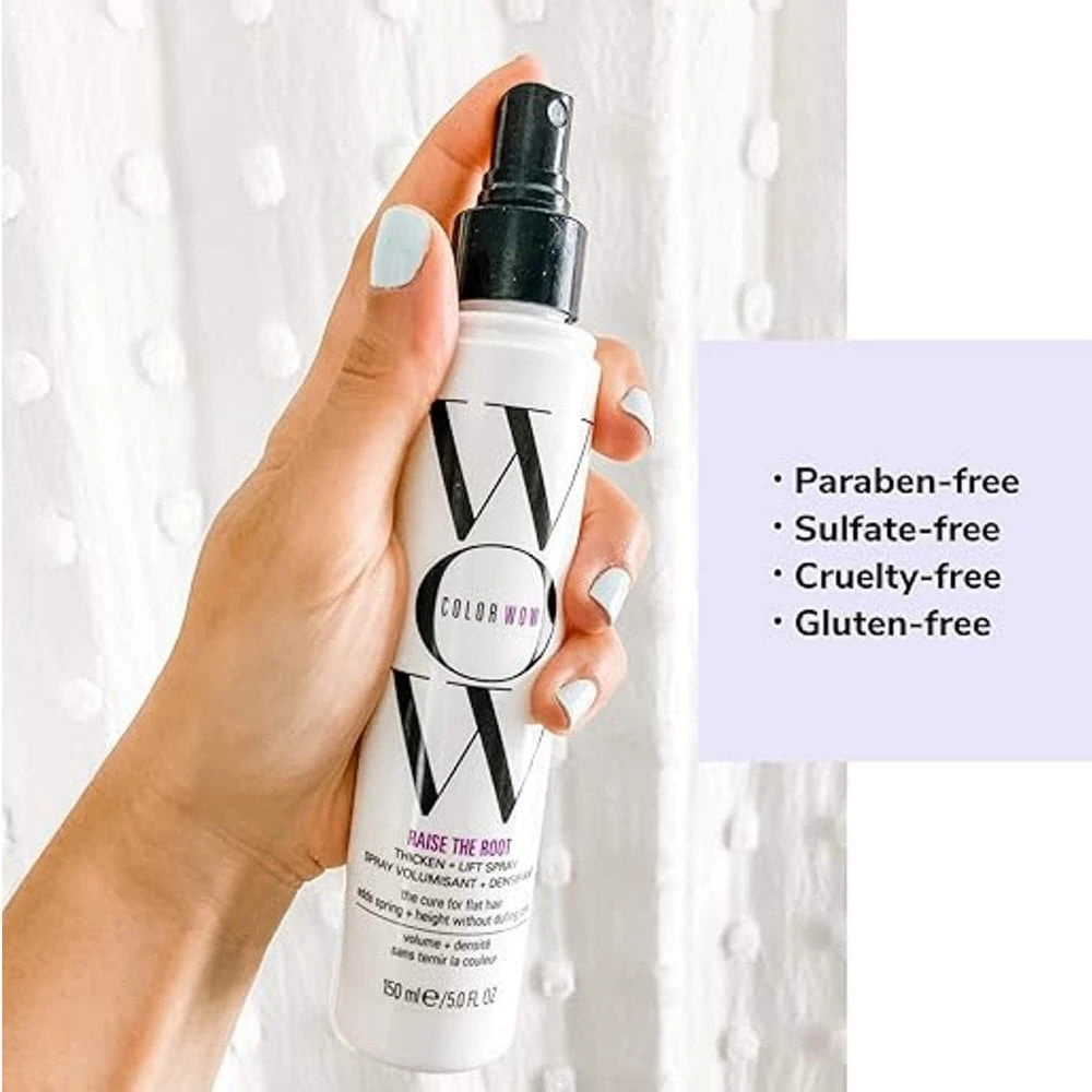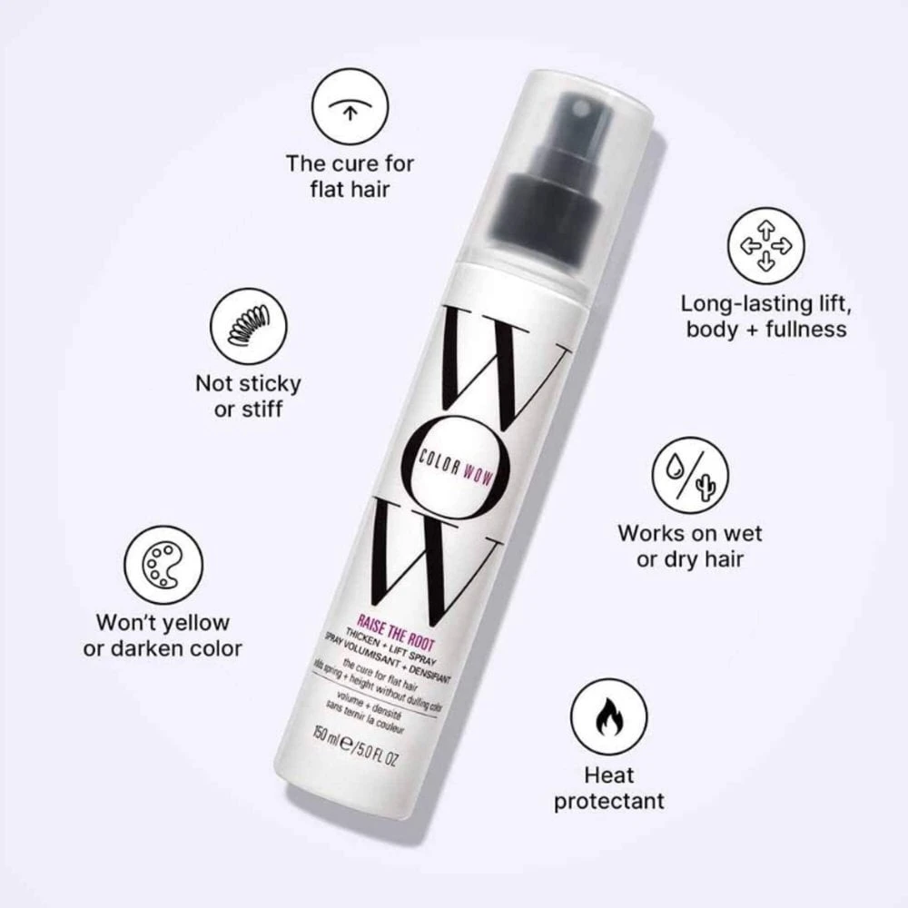 The Color Wow Raise the Root Thicken and Lift Spray provides all-day root lift and volume; never sticky or stiff & offers heat protection. Suitable for all hair types; ideal for fine, flat and thin hair.