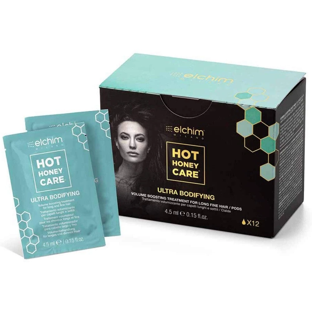 Hot Honey Care Ultra Bodifying developed by Elchim laboratories in the only 3 in 1 system to dry, style and volumize the hair lengths in one single pass. The treatment, combined with the use of Elchim hair dryers, transforms the hair during drying and styling with an immediate effect. The heat and air flow of the hairdryer activate the natural principles of honey and micro seaweeds extracts, for uniform distribution on the hair lengths.
