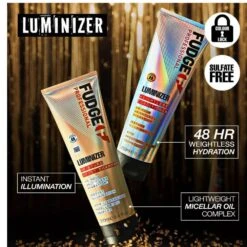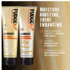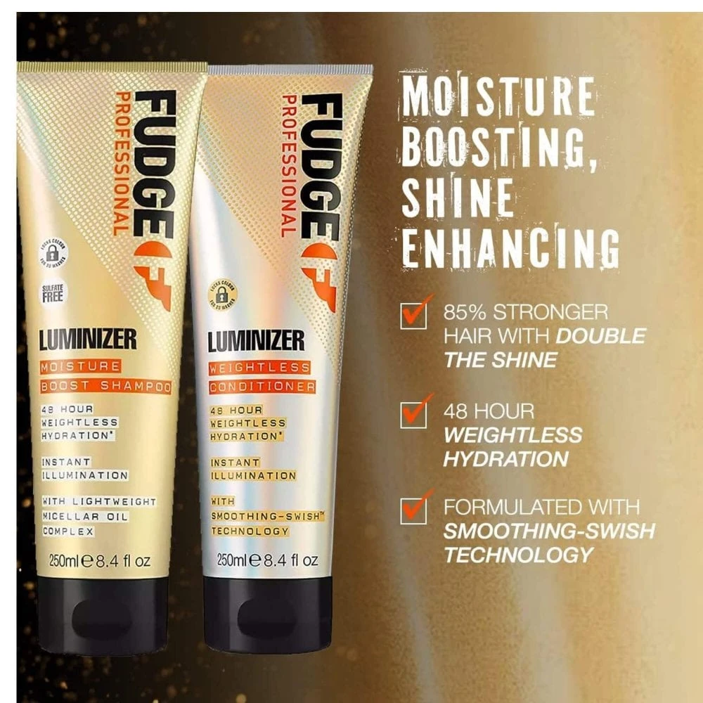 Restore sleek, glossy locks with Fudge Luminiser Shampoo; a radiance-reviving formula that works to eliminate frizz and flyaways for salon-worthy results. Combining innovative Opti-PLEX™ technology with a nourishing blend of Argan and Abyssinian Oils, the rejuvenating shampoo gently eliminates impurities and product build-up, whilst replenishing weightless, long-lasting moisture from root to tip. Hair feels refreshed and hydrated with mirror-like shine and a super-smooth finish. Not tested on animals.