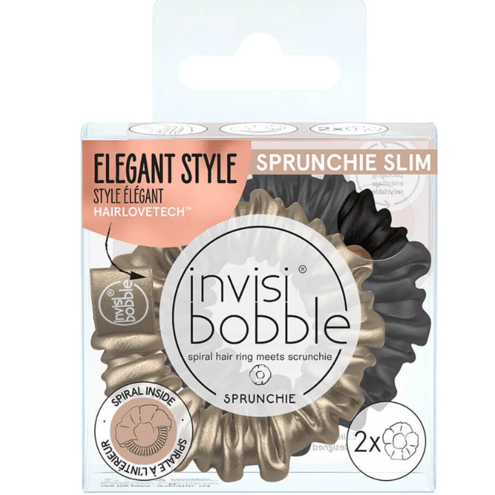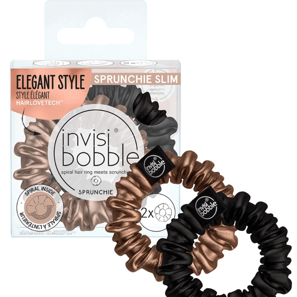 The style icon invisibobble® Sprunchie now in an elegant design. Due to the Slim hair spiral inside, it offers superior comfort, while the soft, satin-like material brings a timeless design. There are two colour options in the box, bronze and black, for limitless slim and sleek hair dos. Invisibobble®’s scientifically proven Hairlovetech™ ensures that invisibobble® hair ties leave less traces, less damage and less pain to your hair!