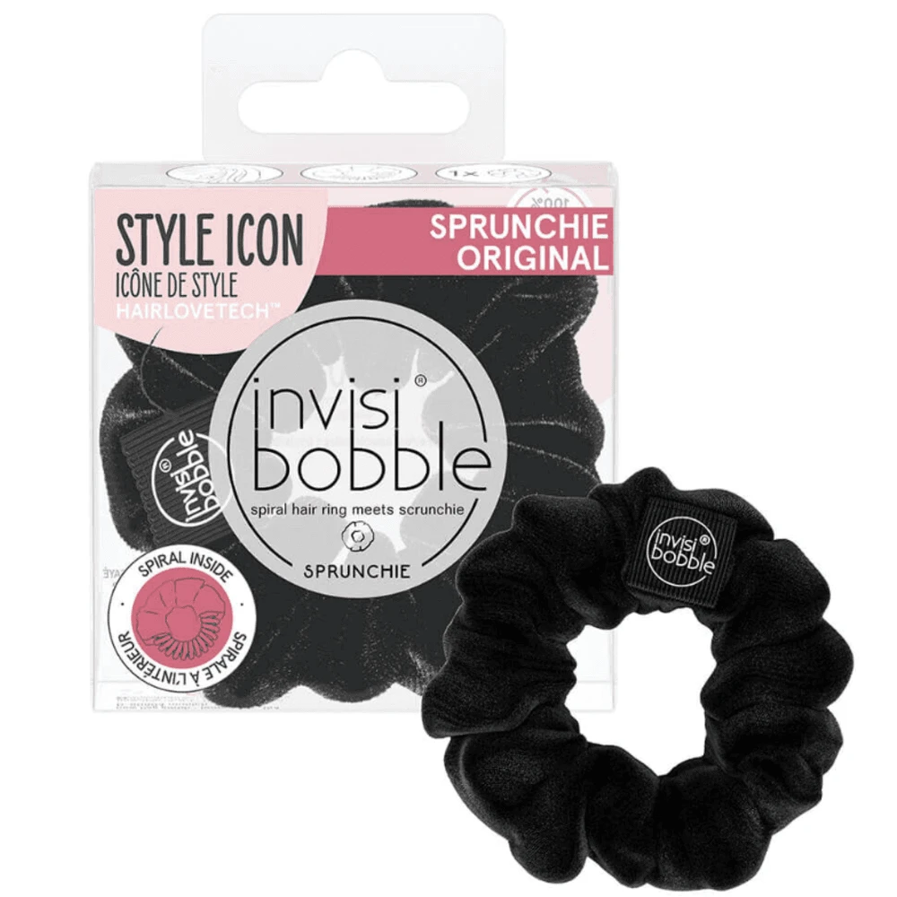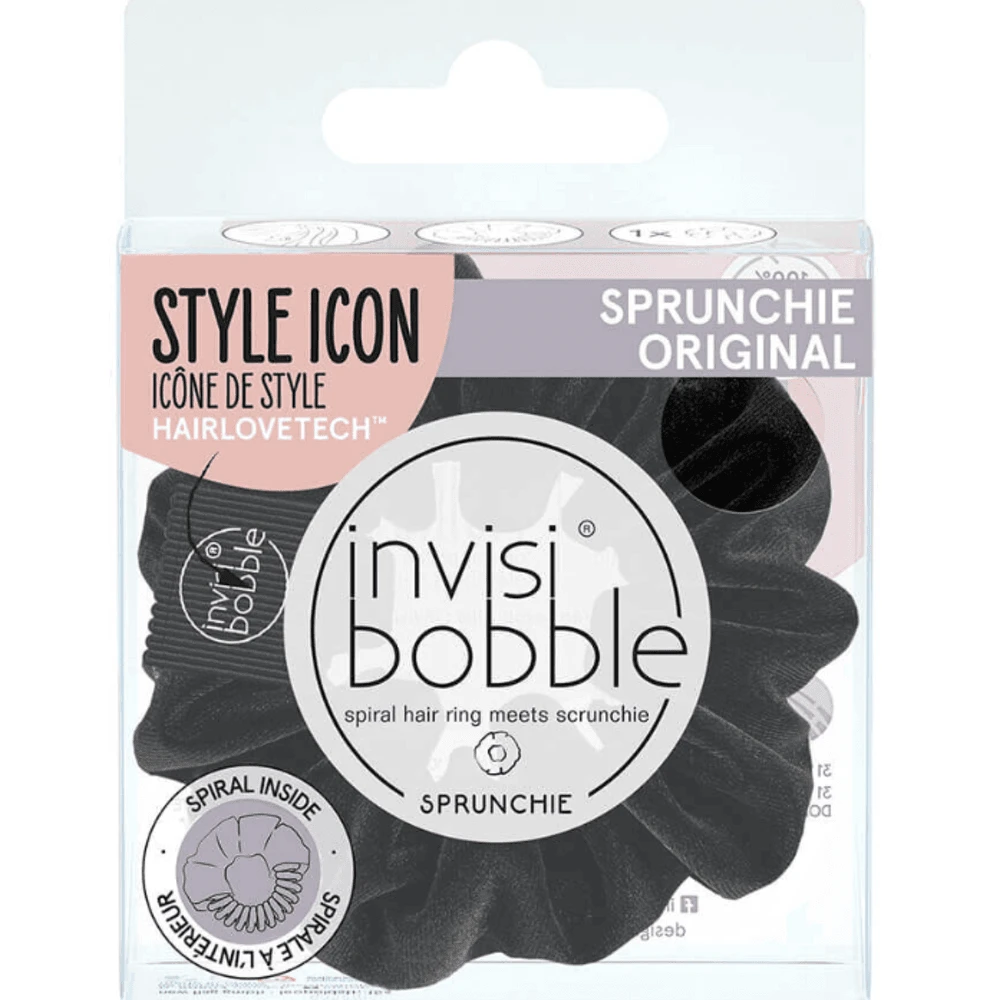 Hidden underneath the luxurious fabric, the invisibobble® Sprunchie contains a classic Original spiral, therefore providing benefits that come with its super talent. Due to its spiral shape, the hair tie holds all strands of hair together and is still easy to remove. Invisibobble®’s scientifically proven Hairlovetech™ ensures that invisibobble® hair ties leave less traces, less damage and less pain to your hair!
