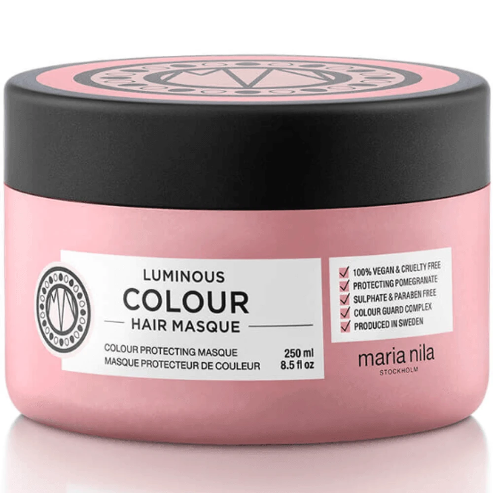 Indulge in a gentle treatment for your hair with Maria Nila Luminous Colour Masque. It moisturises and nourishes for a silky smooth result. Pomegranate extract and colour guard complex protect hair and reduce the loss of colour associated with washing, heat styling, UV rays and free radicals. Supplied in a 250ml bottle. All Maria Nila products are 100% vegan and PETA approved as not being tested on animals.