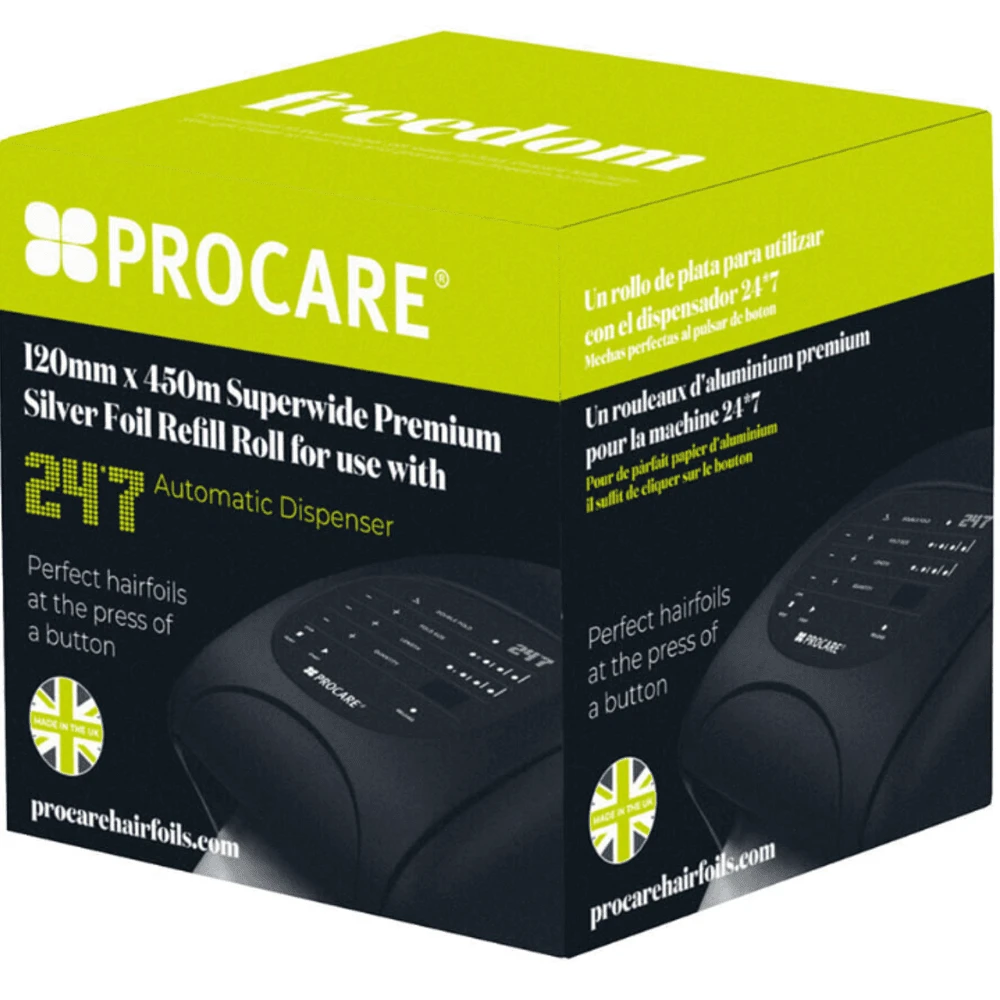 Premium aluminium silver foil refill for use with the Procare 24-7 machine. Supplied on an easy fit core to make re-loading your 24-7 Dispenser incredibly easy. Strong and flexible, suitable for all colouring techniques. Extra wide for specialist colouring techniques.