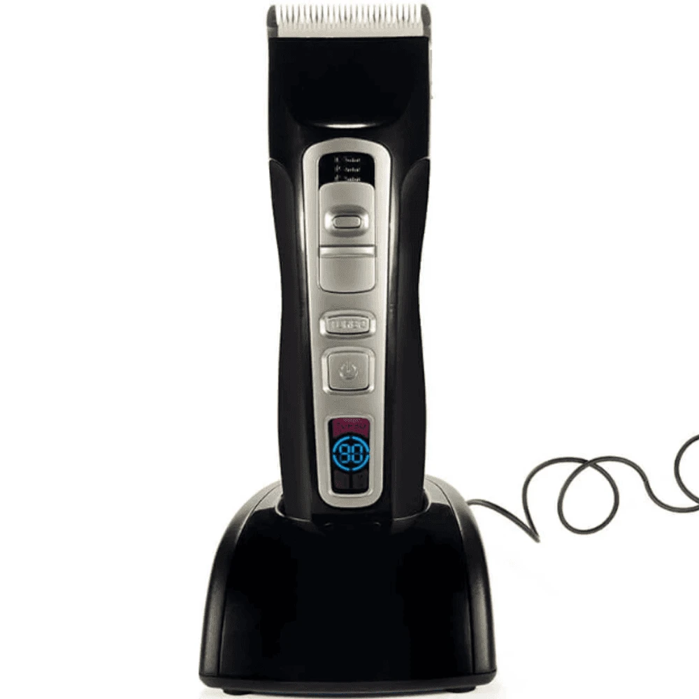 Proxelli Professional clipper for battery use or use with cord. Titanium coated fixed blade combined with ceramic moveable blade. The adjustment mechanism enables 4 levels of precise cutting lengths. 4.6cm length blade. With special TURBO-function. The LCD display shows the remaining operating time in minutes. Lightweight. 90 minute operating time. Charger included. UK plug