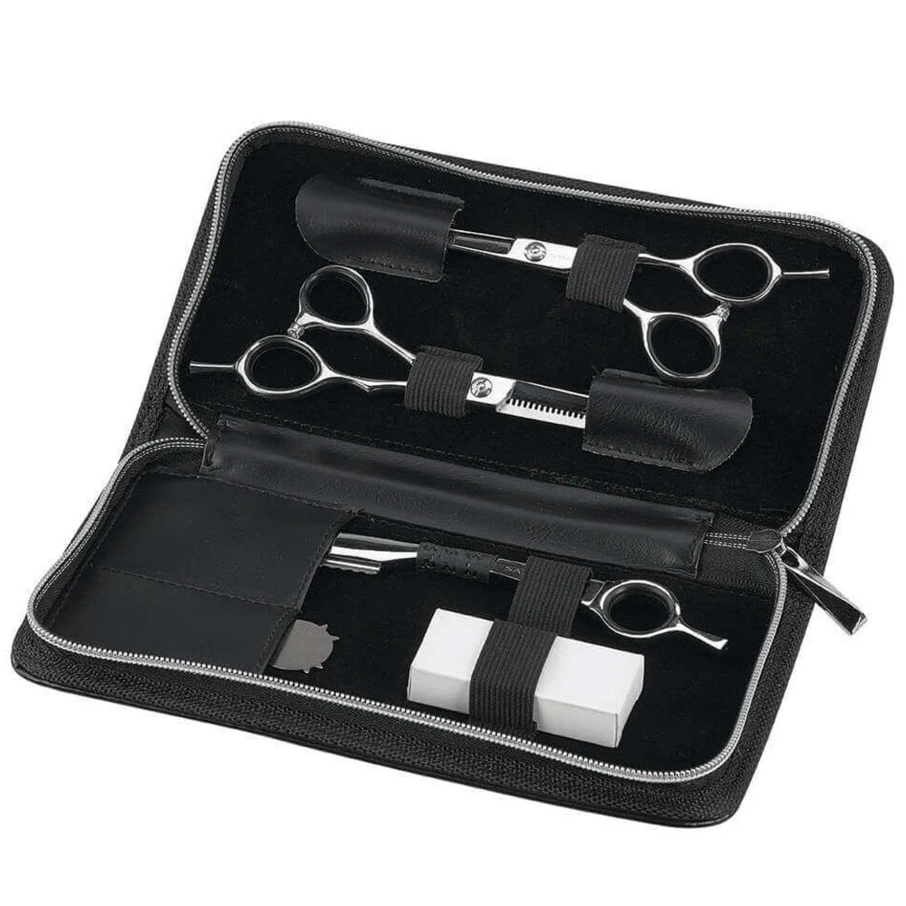 Micro serrated blades – ideal set for starters or students – offset ergonomic handles – in a convenient zip up pouch – 1 hair scissors, 1 thinning scissors with 28 teeth, 1 hair razor + 5 spare blades, 1 tension key.