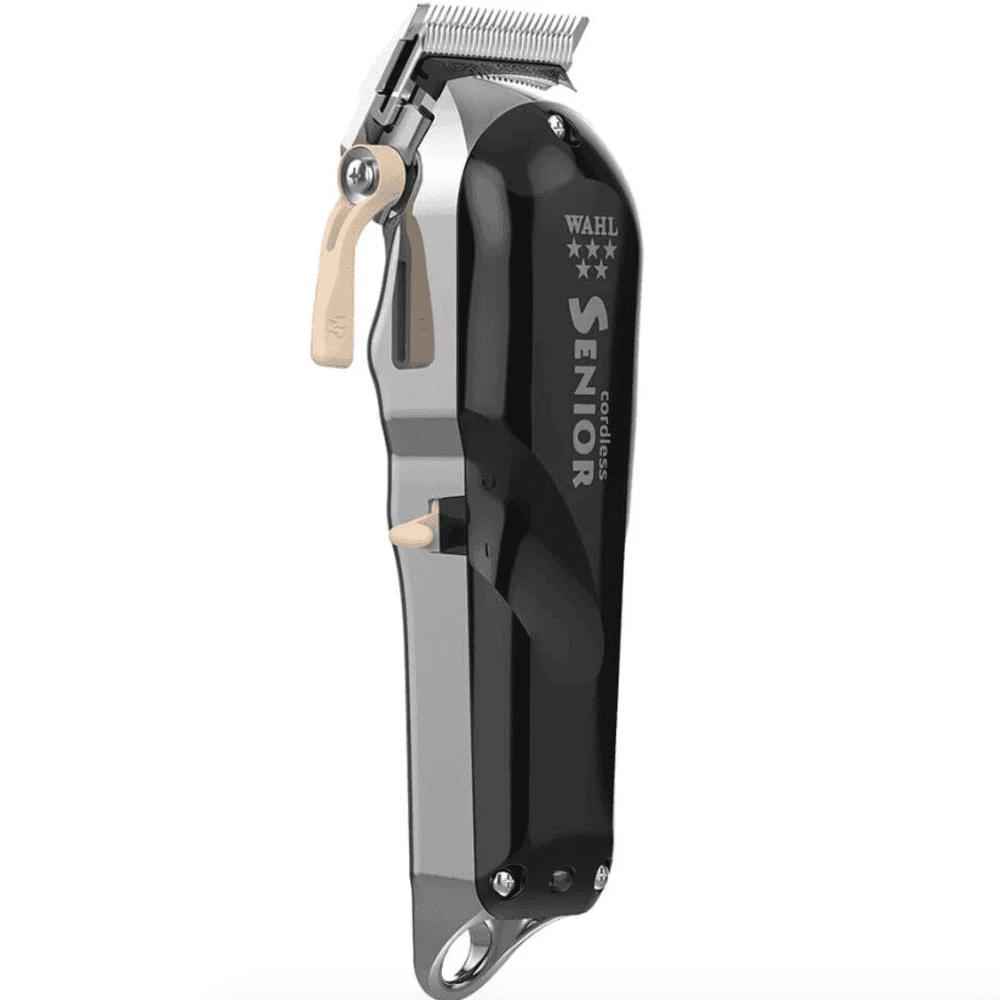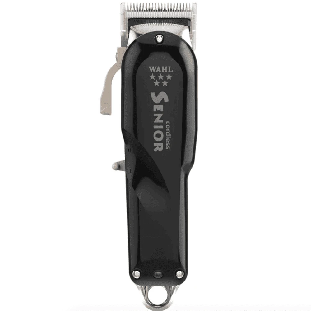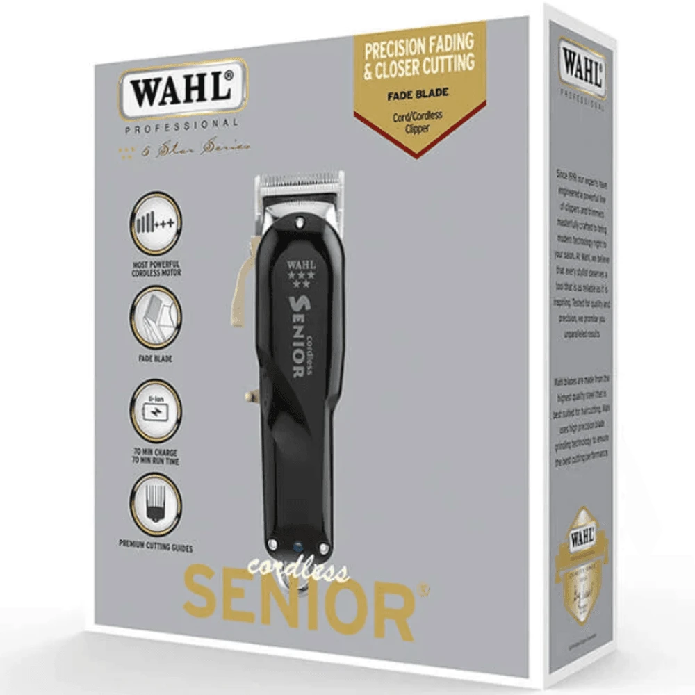 The Wahl Cordless Senior features our most powerful motor in a cordless Wahl clipper that generates a higher blade speed with increased torque for more cutting power. The revolutionary Lithium Ion battery technology is lightweight and powerful providing up to 70 minutes run time from just a 70 minute charge. Featuring an adjustable thin profile blade for precision fades, with a flat bottom that allows for closer cutting. The blade adjusts to zero overlap with a thumb adjustable taper lever for increased flexibility. This product has a UK plug. Retaining the iconic design known and loved by barbers worldwide, the Cordless Senior combines classic aesthetics with modern technology. The aluminium metal bottom housing provides a sturdy, robust grip with a weighted feel for precision and control. Complete with 10 premium attachment combs with Secure-Fit Technology, ensuring a stronger hold to the blade that provides a smoother cutting experience The result is a durable clipper that is built to last and designed to perform.