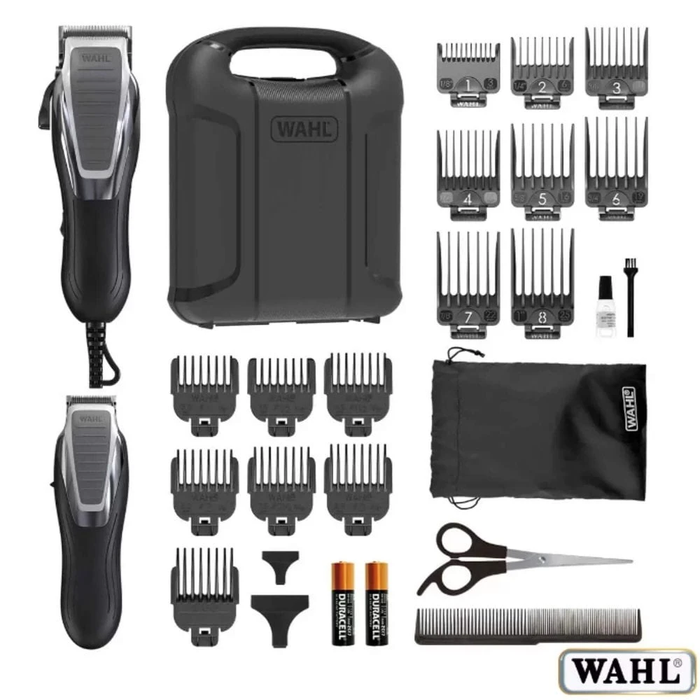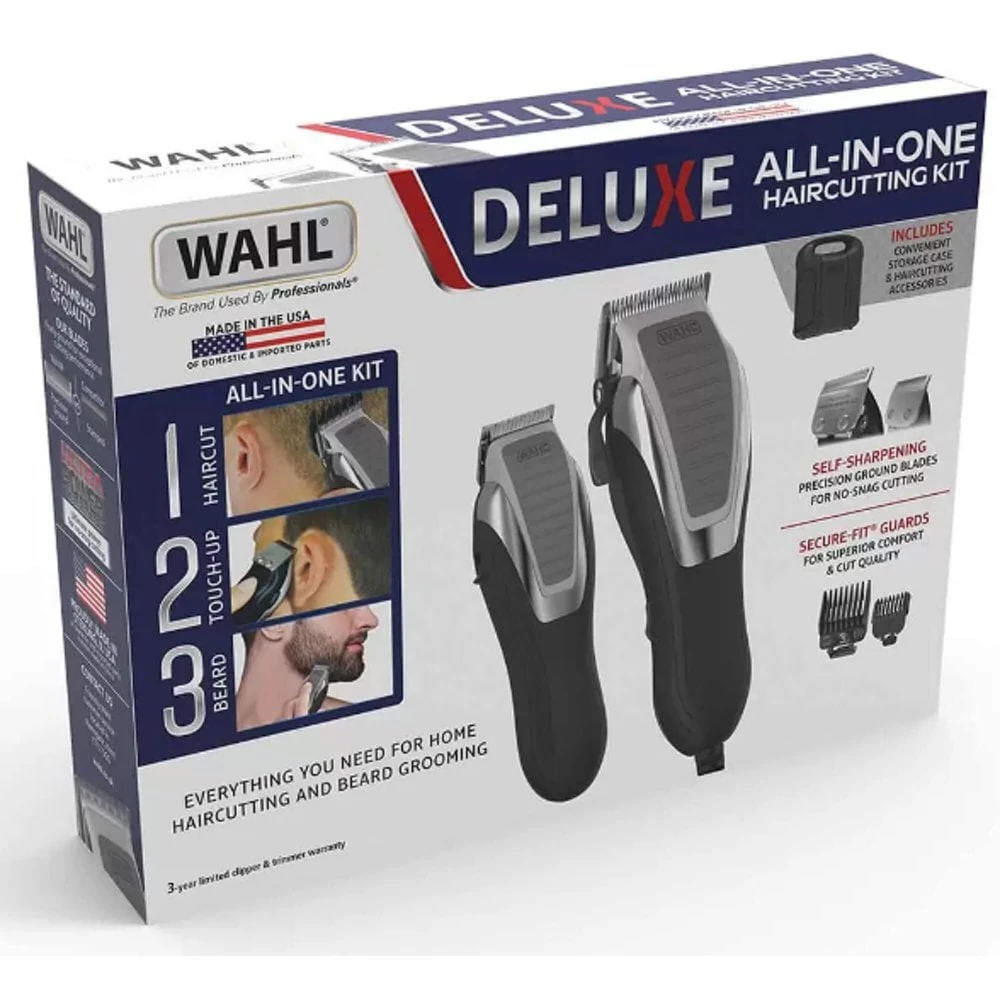 Wahl Deluxe Haircutting Kit, a complete all-in-one haircutting, touch-up, and beard trimming kit. Includes hair clipper, detail battery trimmer, and haircutting accessories – everything needed to complete a successful haircut at home. The corded clipper features an ULTRA-POWER™ power for no-snag cutting and self-sharpening precision blades for cutting the thickest of hair. Includes attachment guards for both clipper and trimmer for fool proof haircuts and beard trimming.