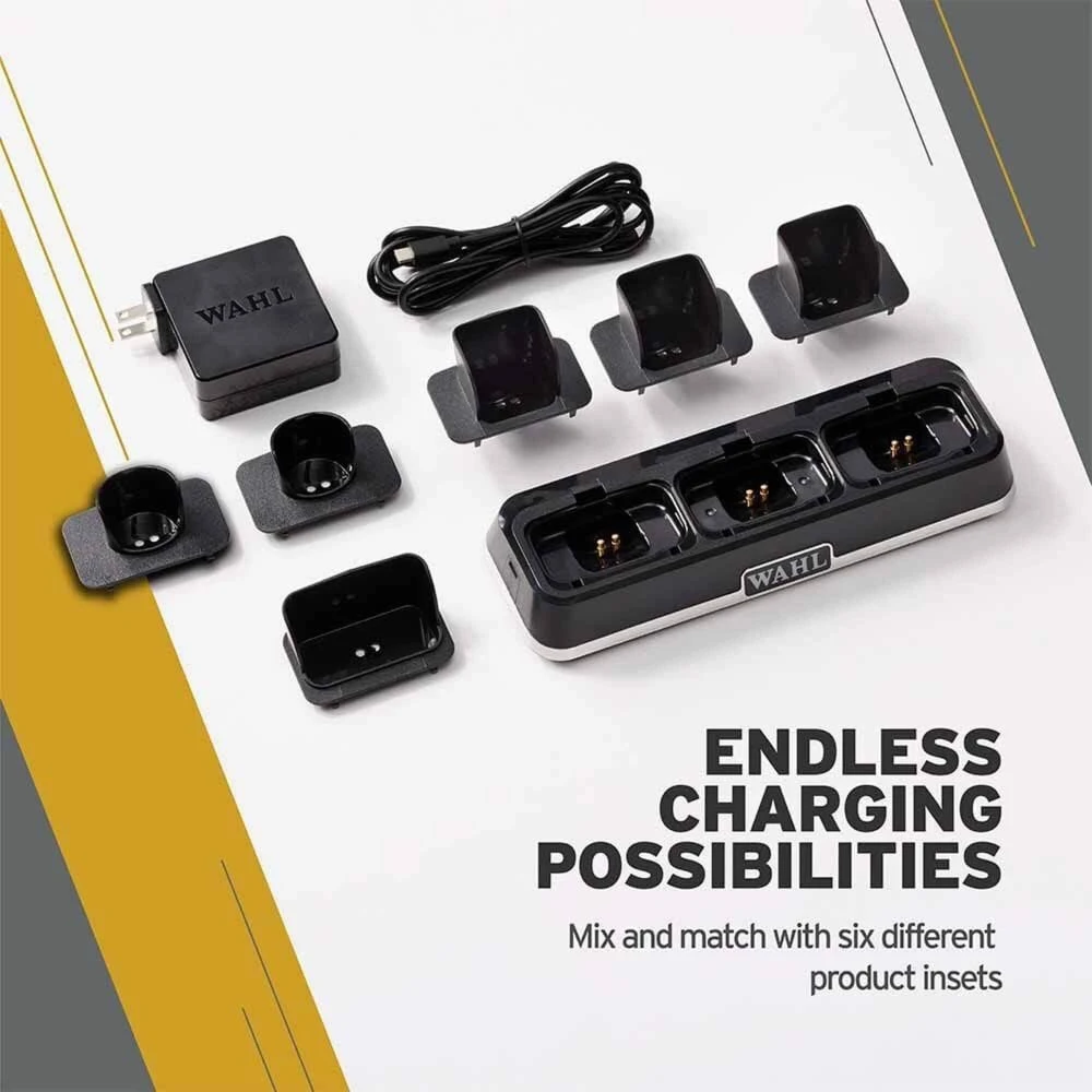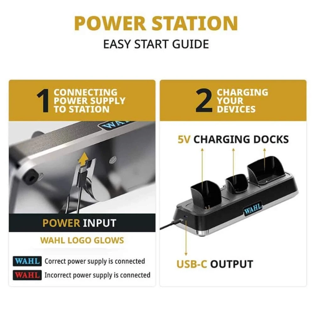 Gone are the days of slow wireless chargers and stations cluttered with chargers and cords. Introducing the new Wahl Professional Power Station™—a game-changing product for Wahl users seeking innovative ways to stay at the highest levels of performance. The Power Station charges three cordless 5V Wahl tools at the same speed as one, keeping your top three tools ready for every client. Six interchangeable inserts let you charge virtually every combination of Wahl in your collection, so customise (and re-customise) your Power Station to best fit your day’s workflow. With power to spare, we even added an auxiliary USB-C charging port to charge your phone, tablet or mobile payment device—all clutter-free, thanks to a single, rotatable cord. It allows the Power Station to tuck neatly flush against any wall. Take charge of your station and your day with the Wahl Professional Power Station.